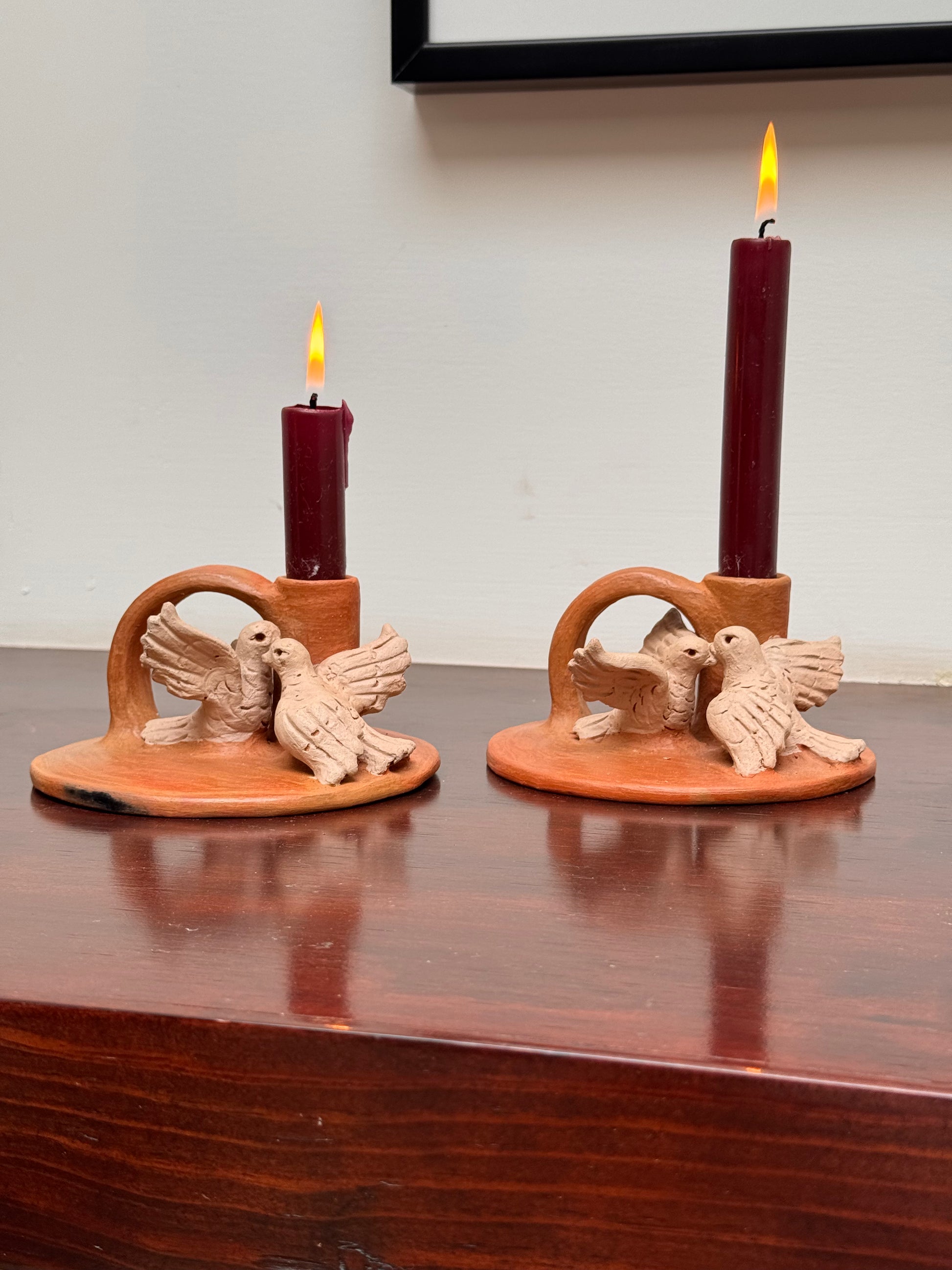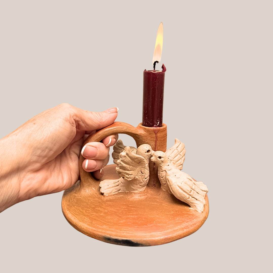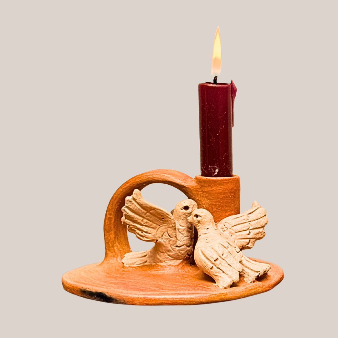 El diseño incluye palomas esculpidas, símbolo de paz y unión, que convierten este candelabro de barro hecho a mano en una pieza especial de artesanía mexicana, ideal para decorar mesas, altares o espacios del hogar con calidez y tradición.