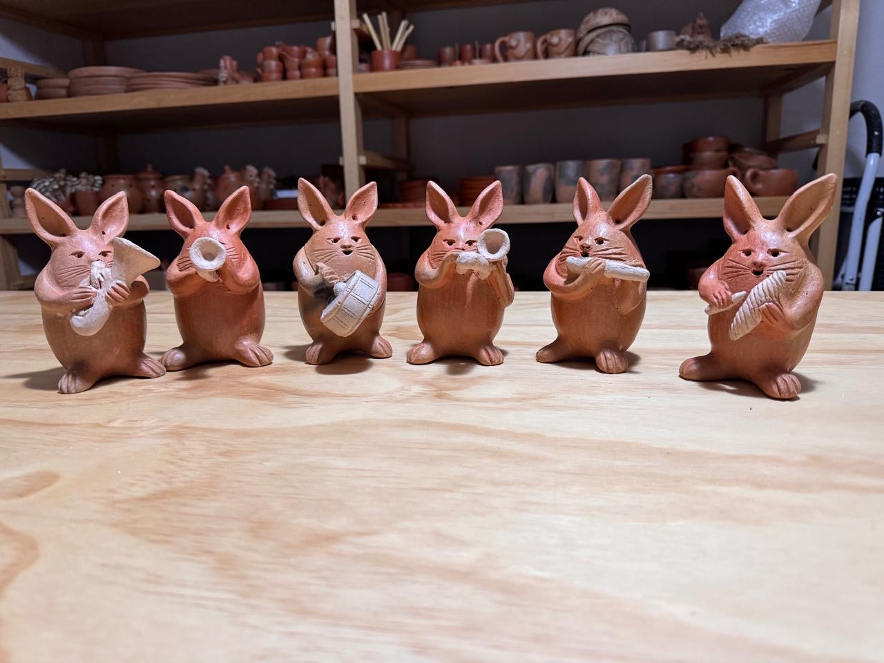 Dale un toque de encanto y creatividad a tu espacio con estas exclusivas piezas "Banda Musical de Conejos". Inspirado en la alegría de la música y la ternura de estos pequeños músicos, estas esculturas están hechas a mano con técnicas tradicionales, logrando que cada pieza sea única y especial.