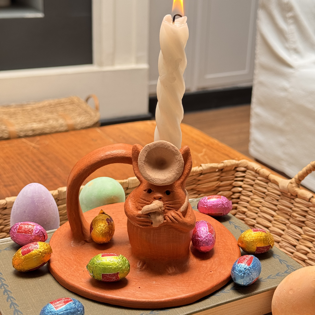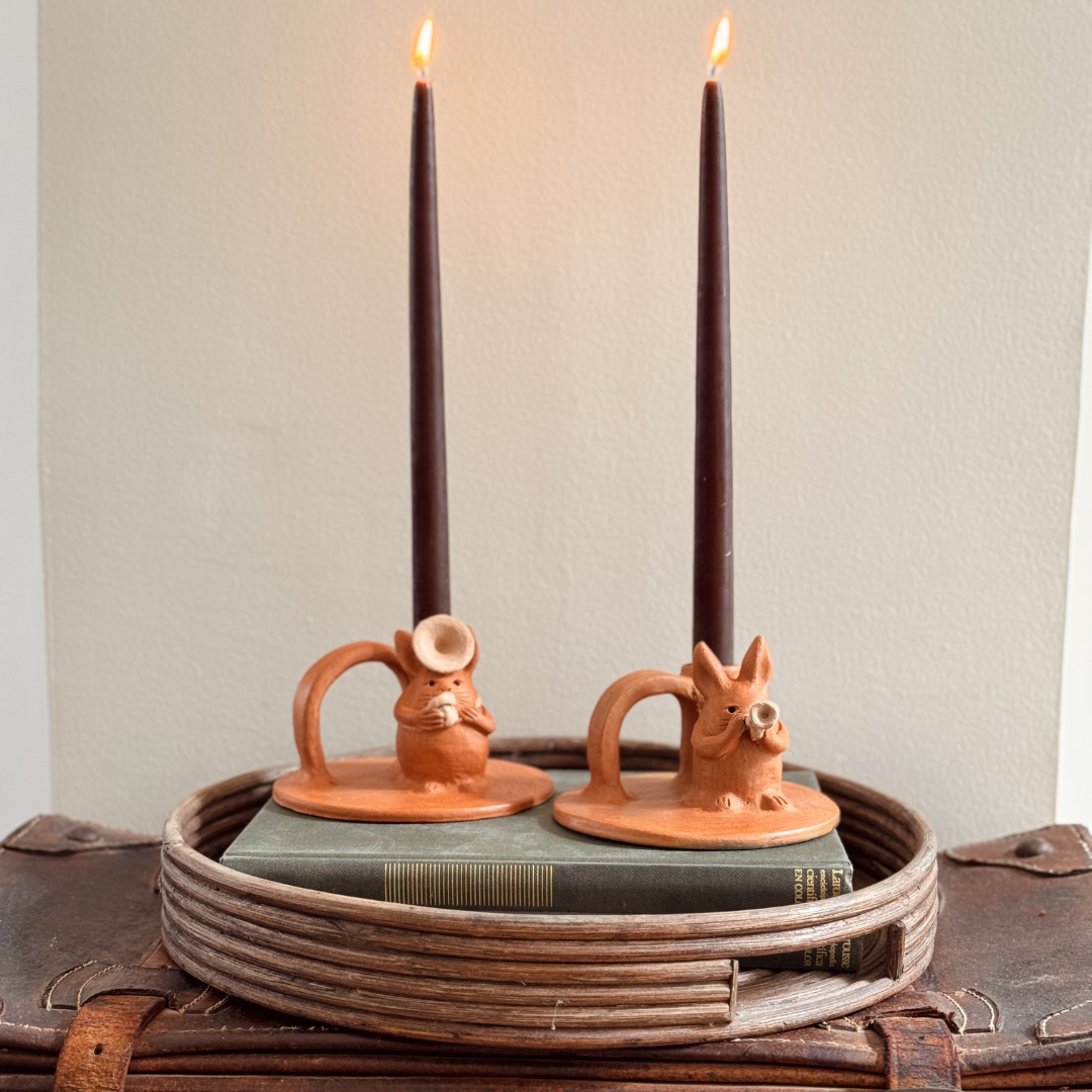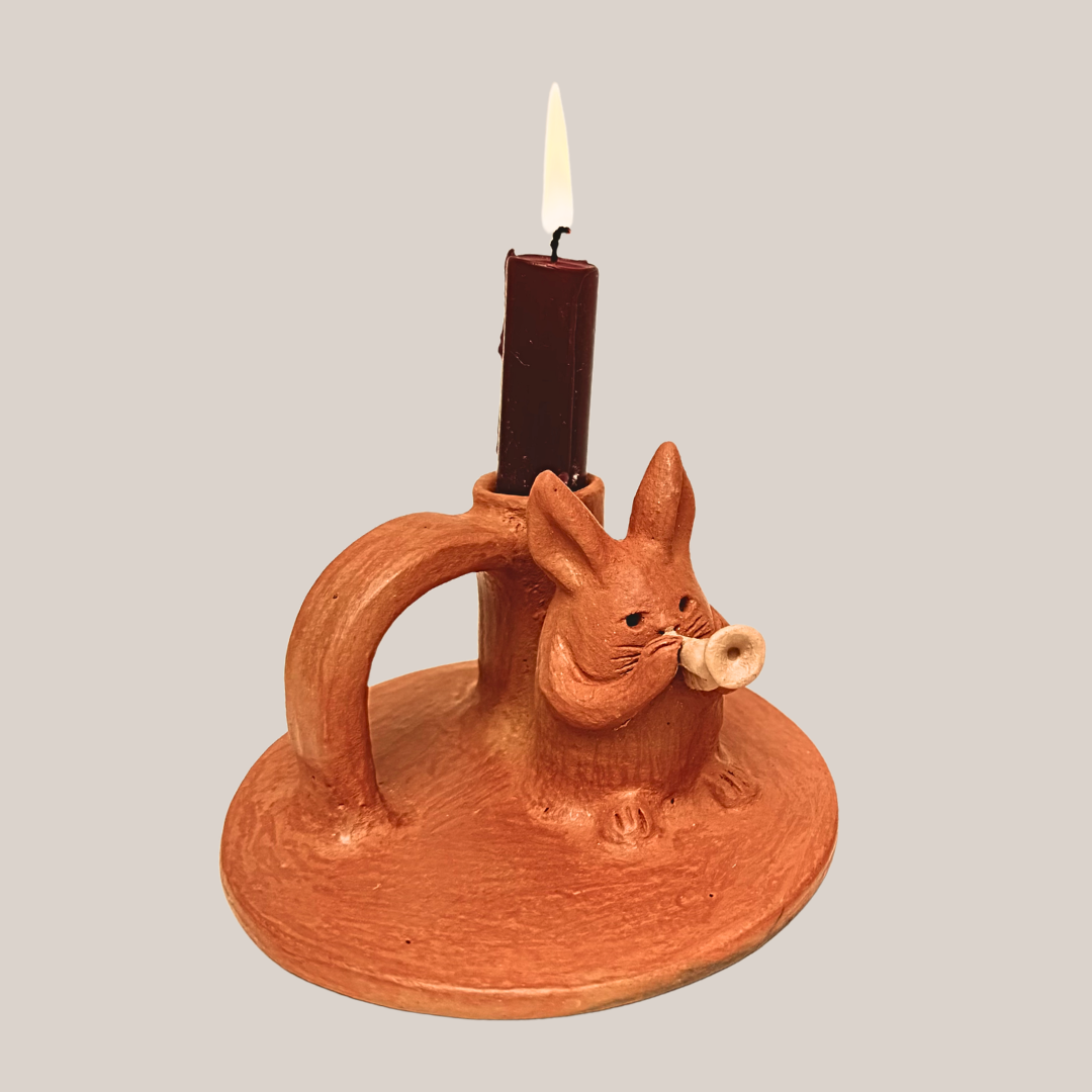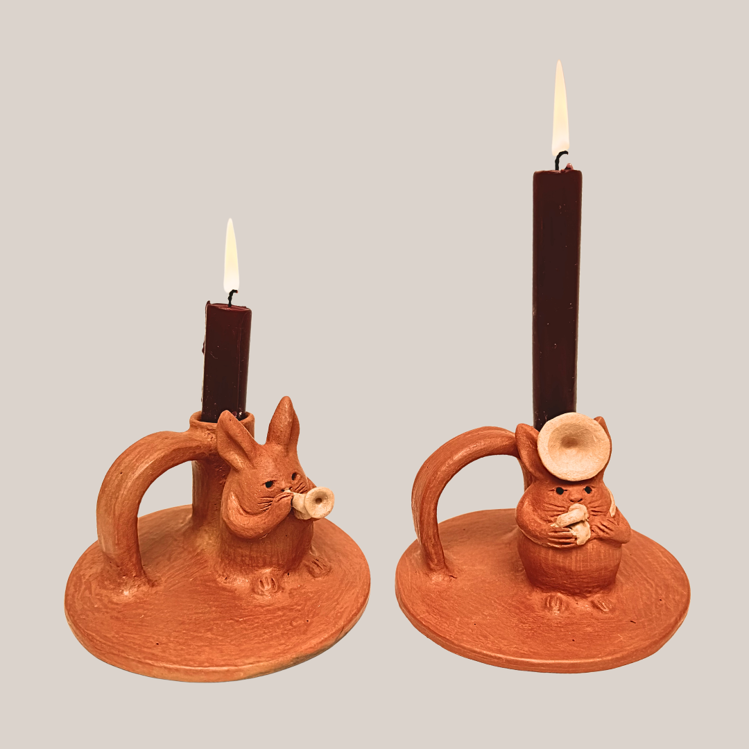 El diseño incluye dos conejos músicos tocando la tuba y trompeta, que convierten estos candelabros de barro hechos a mano en piezas especiales de artesanía mexicana, ideales para decorar mesas, altares o espacios del hogar con calidez y tradición.