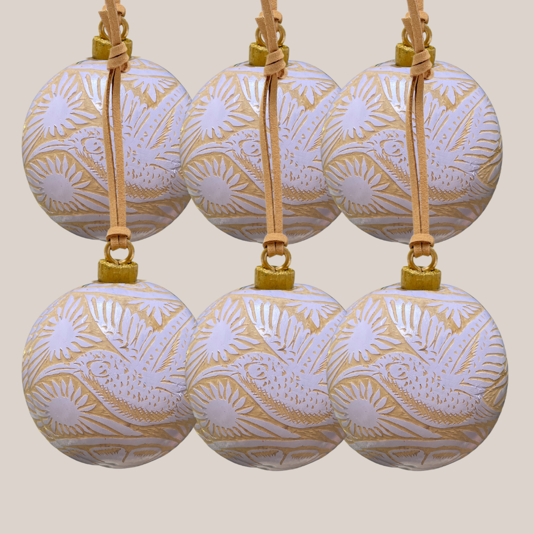 Estas bellas esferas 100% naturales tienen su origen en el árbol crescentia crujete, mejor conocido como “árbol de jícara”, presente en la Región Costa de Oaxaca. Para la elaboración de cada pieza, el fruto es pintado y tallado a mano, representando fauna y flora local.